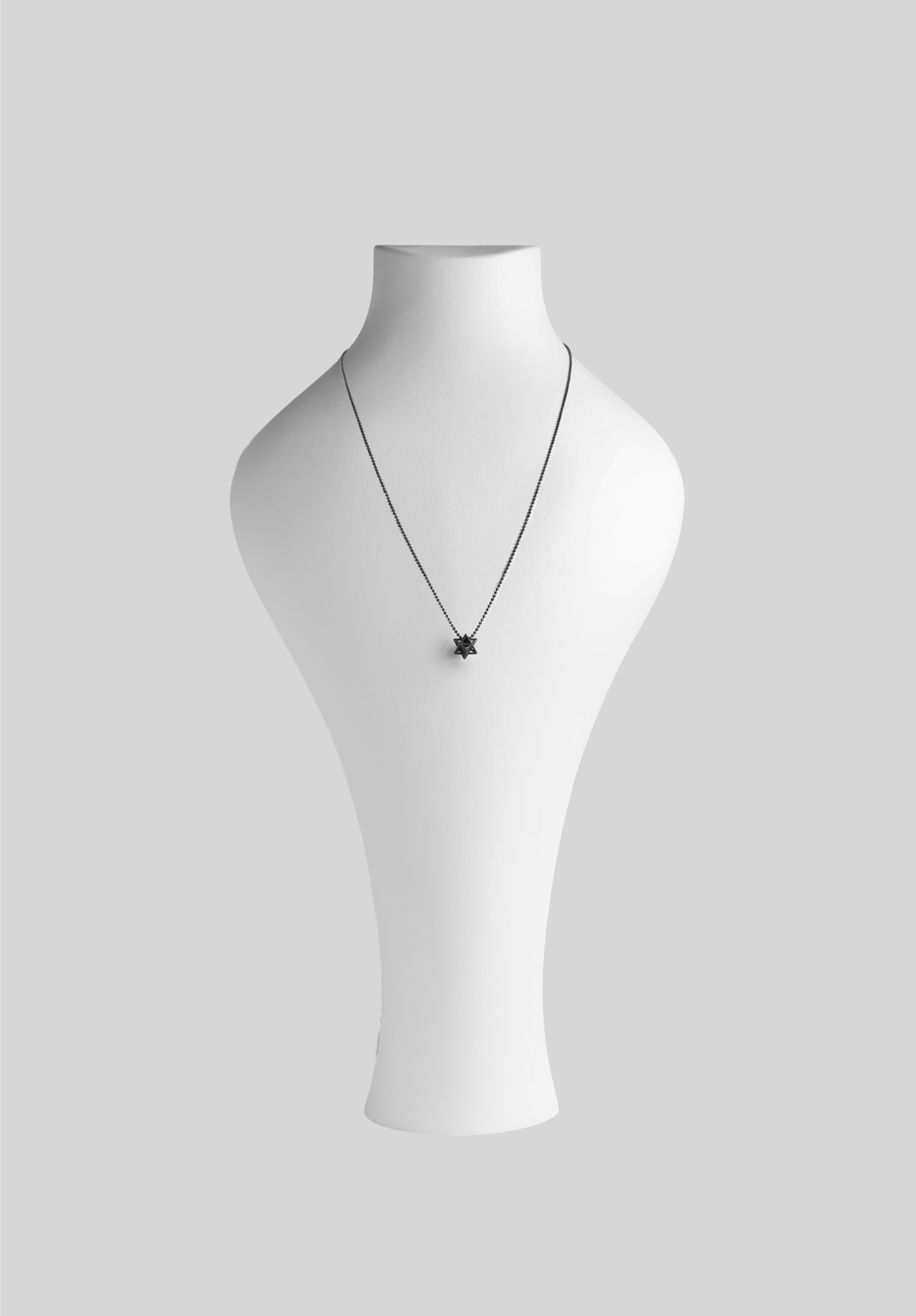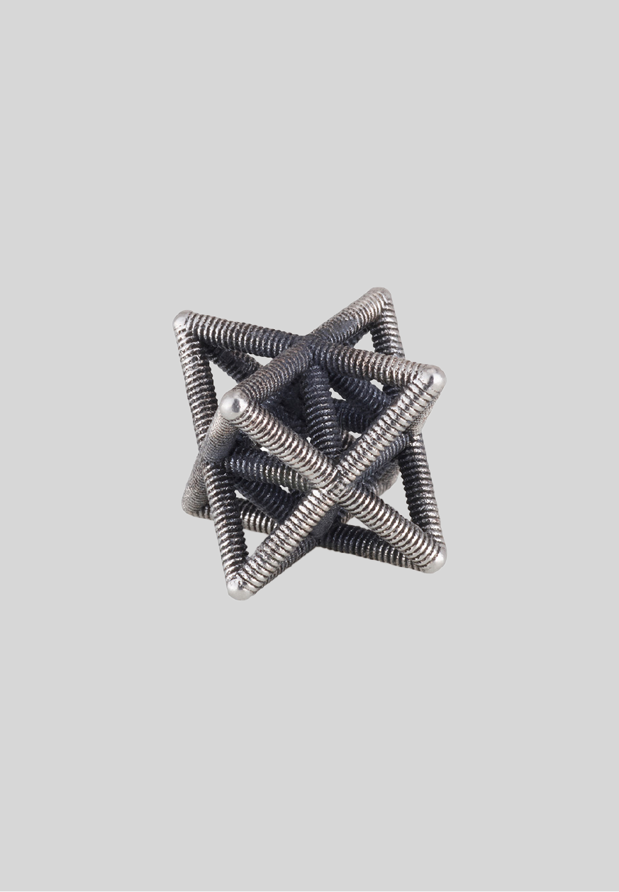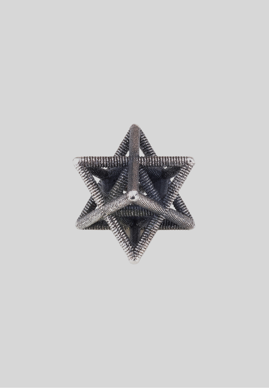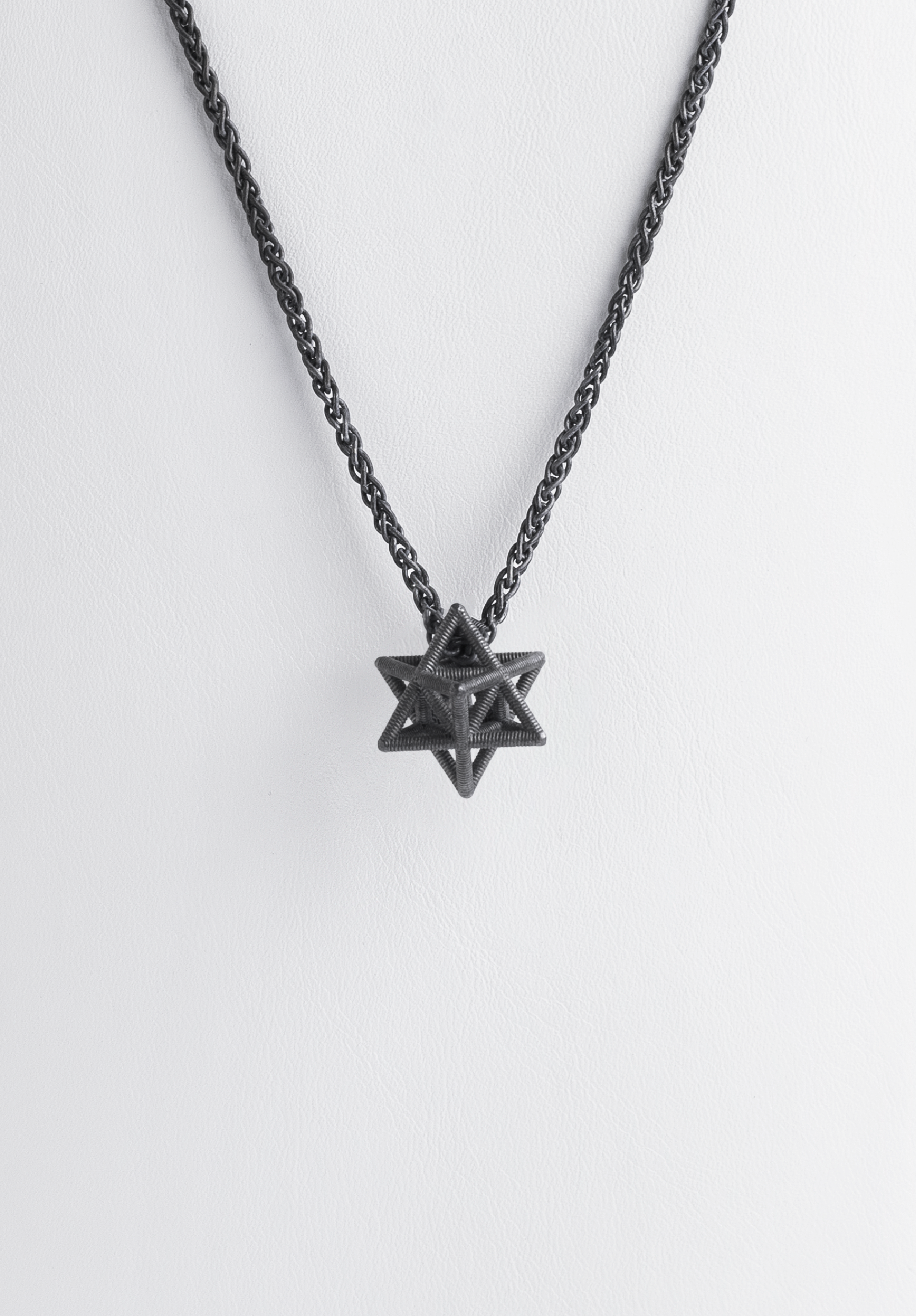 Black silver pendant with a special textured matte-shiny finish. The ribbed structure of the Merkavah is made using a unique technique: the ribs are spiral, the vertices of the Merkavah structure have a shiny finish, giving the jewelry a sparkle and a delicately shimmering light reflection as the body moves, creating a pleasant effect for the observer's eye.