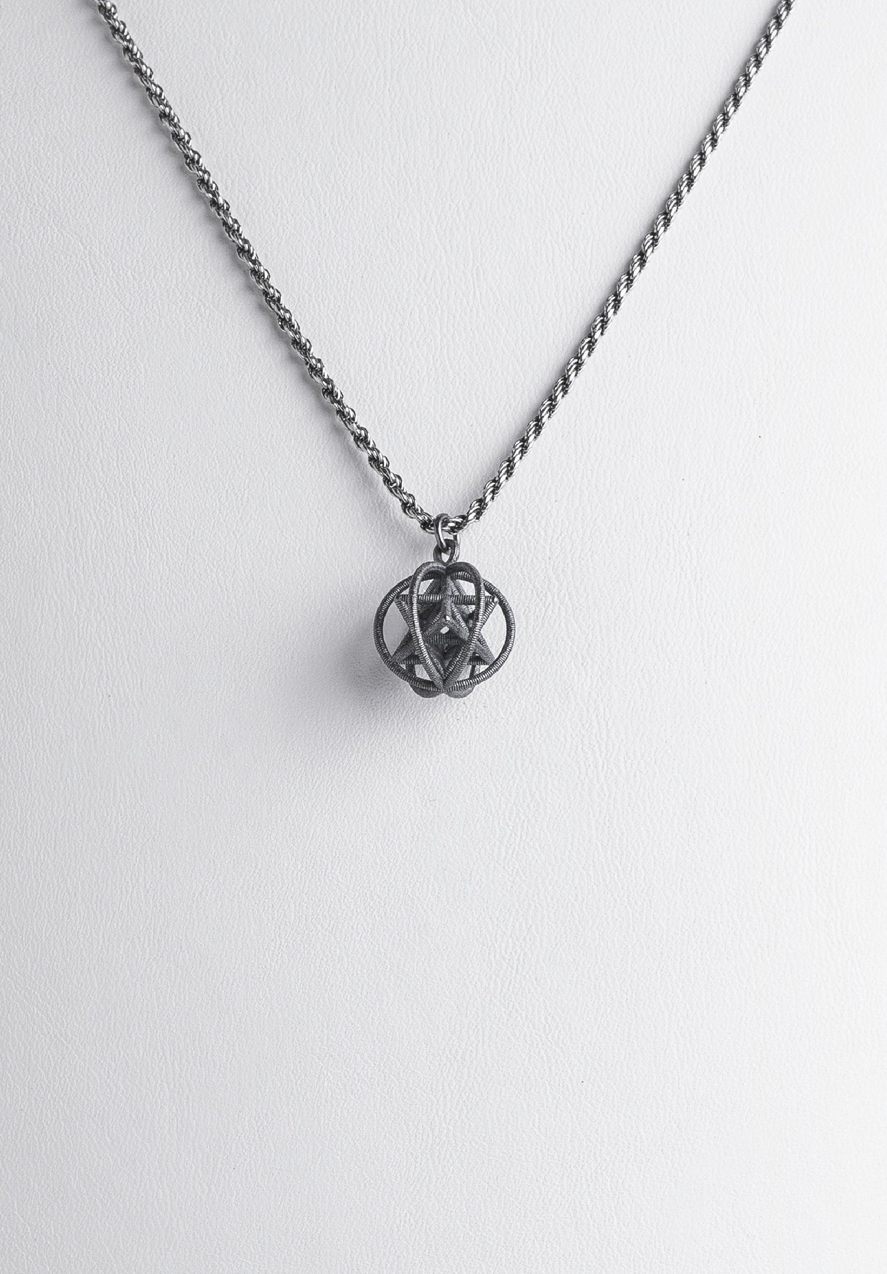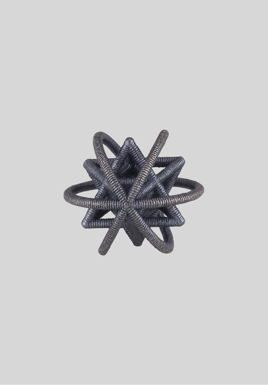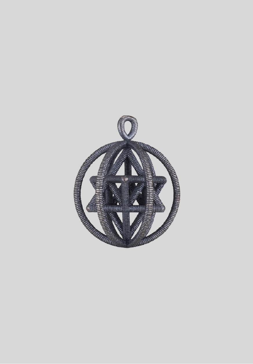 Black silver with a special textured matte-shiny finish. The ribs and crown hoops are spiral, the vertices of the Merkabah structure have a shiny finish, which gives the jewelry a sparkle and a delicately shimmering light reflection as the body moves, ultimately creating a pleasant effect for the observer's eye.